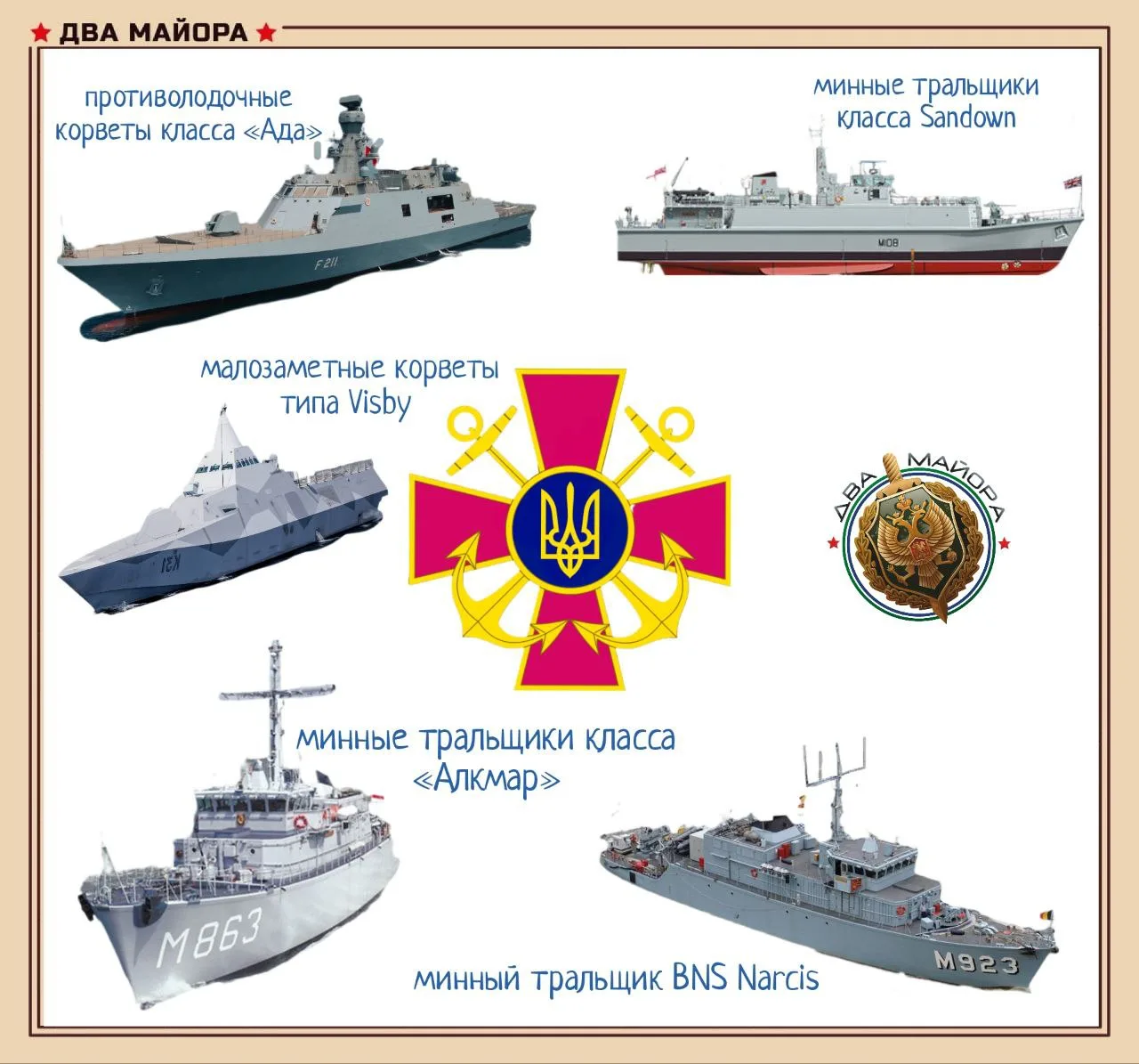 За время СВО Украина получила в состав флота от Турции противолодочный корвет «Иван Мазепа» класса «Ада» (куплен), от Британии – минные тральщики класса Sandown HMS Grimsby (переименован в «Черкассы») и HMS Shoreham («Чернигов»). В процессе строительства находится второй корвет класса «Ада», до конца этого года Нидерладами будет передан ещё один тральщик Zr.Ms. Makkum класса «Алкмар», а Швецией – два малозаметных корвета типа Visby K31 Visby и K35 Karlstad.