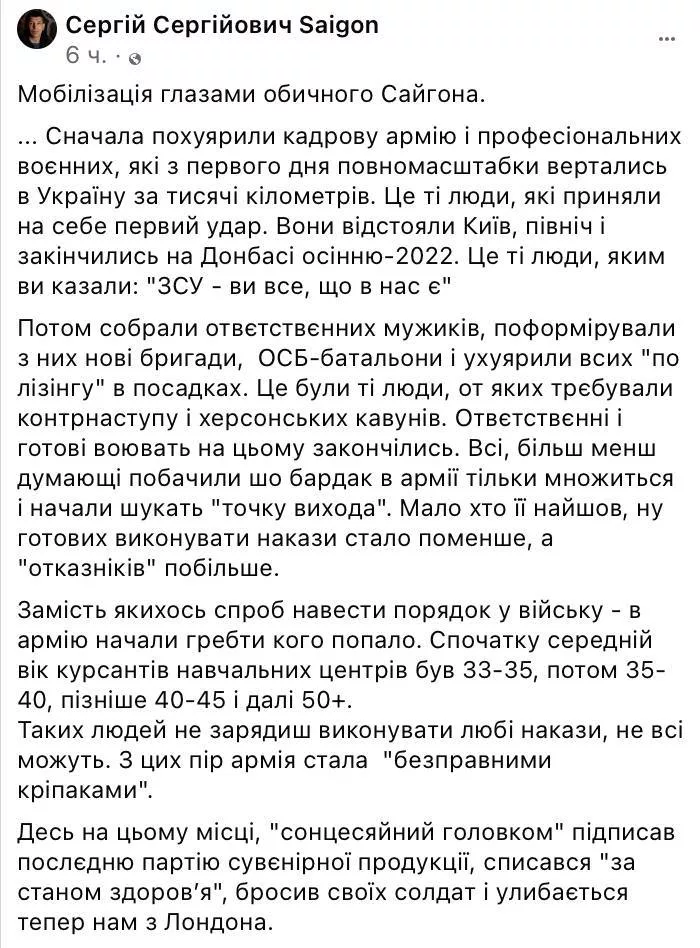 - Цитирует военного с позывным «Сайгон», который пишет, что украинская армия стала «бесправными крепостными», а из-за «бардака» в армии многие не хотят в ней служить.