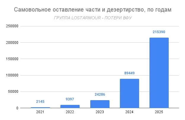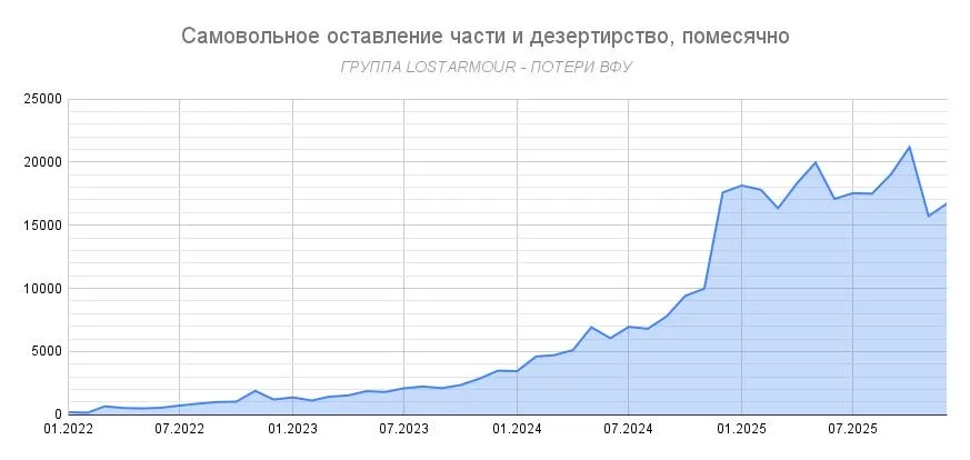Всего за год суммарно сбежало более 215 тысяч человек, что в среднем составляет почти 18 тысяч в месяц. Этот процесс украинские власти пытались остановить как пряником (несколько амнистий для дезертиров и самовольщиков), так и кнутом (отправка пойманных в штурмовые подразделения). Результат на лицо — поток не уменьшается.