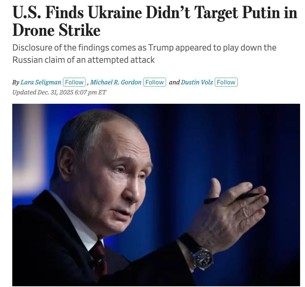 ЦРУ доложило Дональду Трампу, что украинские беспилотники атаковали Новгородскую область, но не пытались нанести удар по резиденции Владимира Путина, пишет The Wall Street Journal со ссылкой на источники.