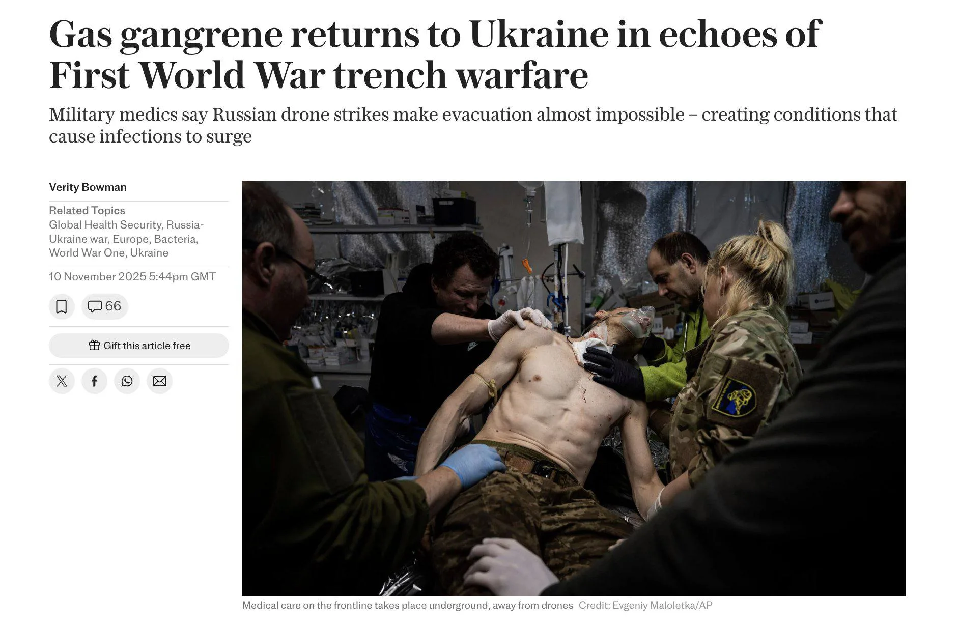 Украинские медики сообщают о случаях появления у раненых газовой гангрены – заболевания, которое когда-то было тесно связано с окопами Первой мировой войны и которое, как долгое время считалось, было практически искоренено в Европе.