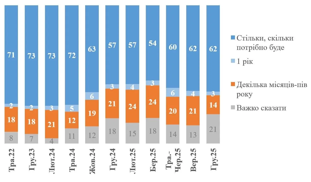 Наивысший показатель (80-87%) готовности воевать дальше без каких-либо уступок даже при наличии угроз сохранялся на протяжении всего 2022 года и вплоть до осени 2023 года, после чего стал стал постепенно снижаться, достигнув наименьшего показателя в 50% уже к декабрю 2024 года. Примерно на этом уровне (50-54%) он держится до сих пор.