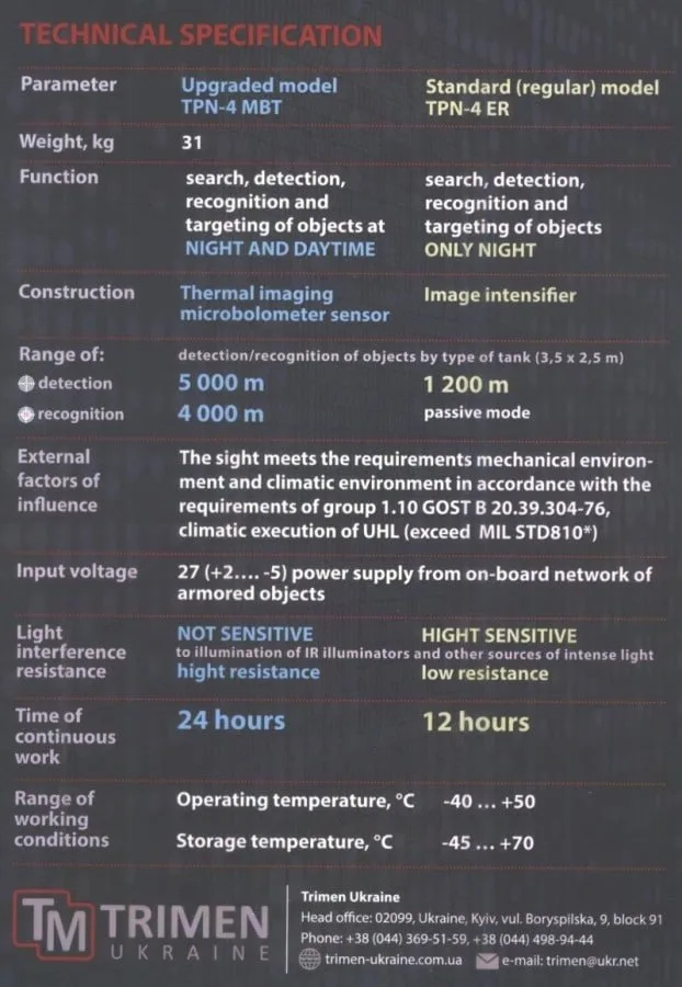 Прицел ТПН-4ЭМбТ также может работать круглосуточно. В результате модернизации этого прибора дальность обнаружения целей была увеличена до 5000 м (против 1200 м в предыдущей версии), а дальность распознавания – до 4000 м.