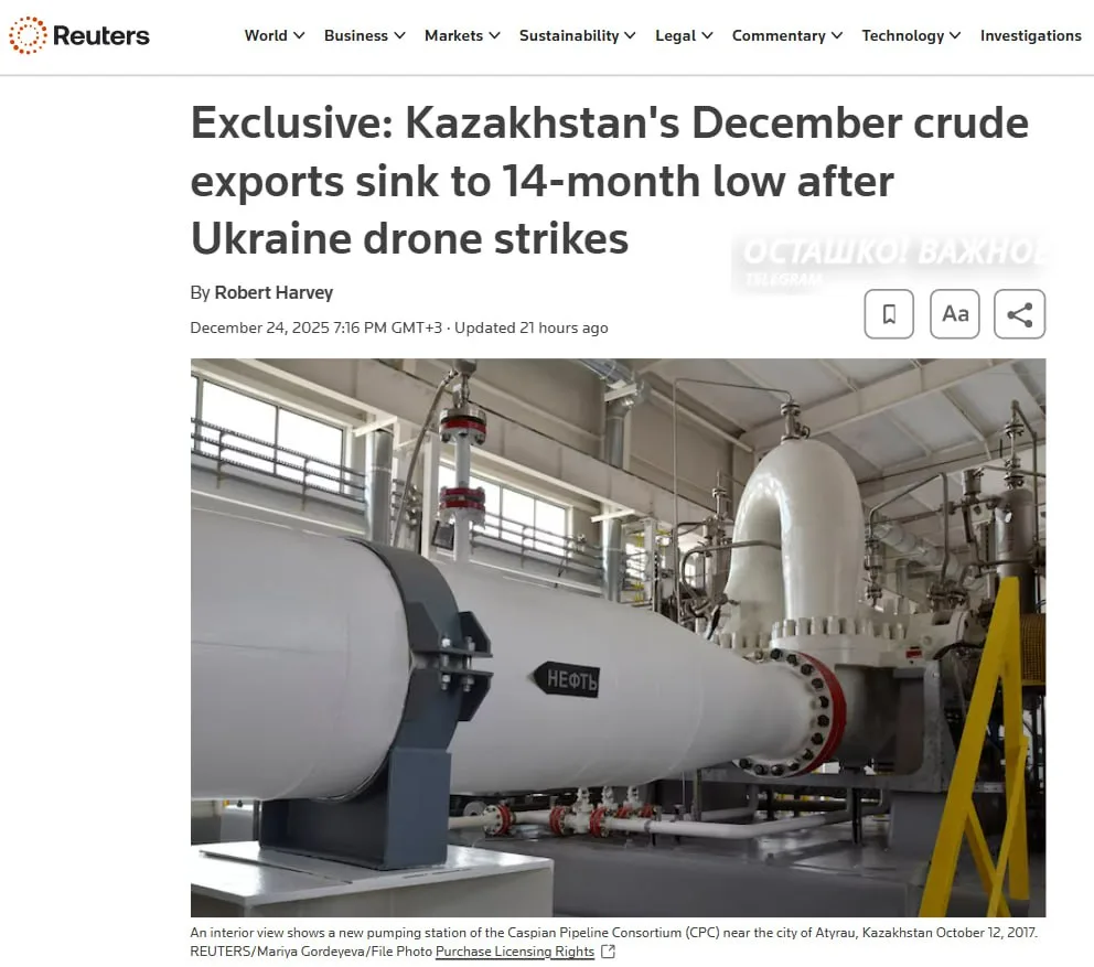 Экспорт казахстанской нефти CPC Blend в декабре рухнул до 1,14 млн баррелей в сутки вместо запланированных 1,7 млн — это минимум с октября 2024 года. Причина — удары украинских дронов по терминалу КТК под Новороссийском и плохая погода, сорвавшая ремонт, — пишет Reuters.