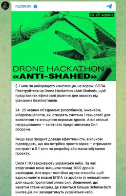 📝 «Если продукт докажет эффективность и военные подтвердят, что он сбивает ударные беспилотники – разработчик получит контракт в $1 млн на разработку или масштабирование проекта», — сообщил глава Минцифры Михаил Федоров.