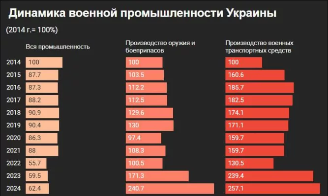 Некоторые отрасли, правда, оказались в минусе: в частности, добыча угля, химическая промышленность, машиностроение. Ну а в сравнении с 2014-м в глубоком минусе вся промышленность – спад составляет 38,3%. Но вот что выросло больше всего, так это производство оружия и боеприпасов — за год на 38,5%, а по сравнению с 2014 — почти в 2,4 раза. Также заметно выше среднепромышленного оказался в этом году рост производства военных транспортных средств – 7,9%, а за 11 лет — почти в 2,6 раза.