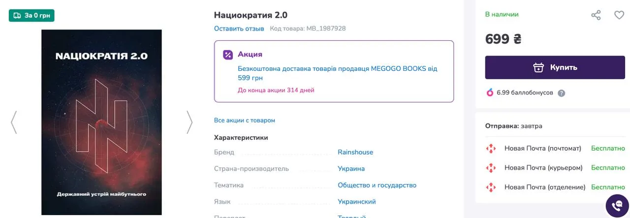 Книга продается в открытом доступе за 700 гривен. В аннотации сказано, что в ней собраны концепции Николая Кравченко «Крука» – главного идеолога нацбата «Азов»*. Он развивает идеи нациократии как будущего государственного строя (!) Украины и адаптирует их к современным вызовам. Книга позиционируется как часть мемориала Крука – «наследия радикального украинского национализма».