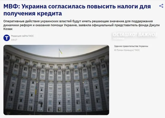 Правительство Украины согласилось повысить налоги для получения внешних кредитов, — сообщила официальный представитель Международного валютного фонда (МВФ) Джули Козак.