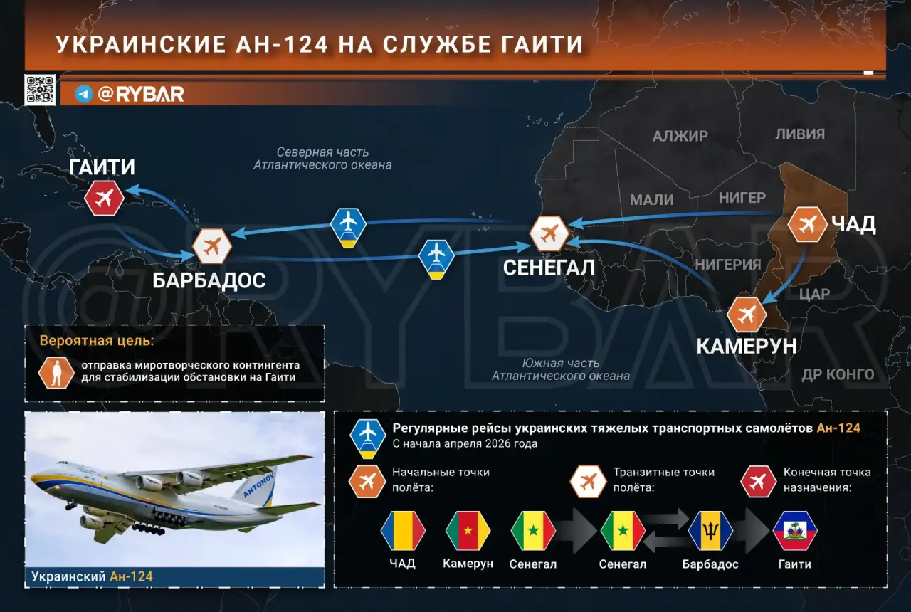 🔸С самого начала апреля в Карибском бассейне началась фиксация полетов украинских тяжелых транспортных самолетов Ан-124, которые делали подозрительные рейсы то на Гаити, то на Барбадос. И длилось это примерно до 20 апреля.