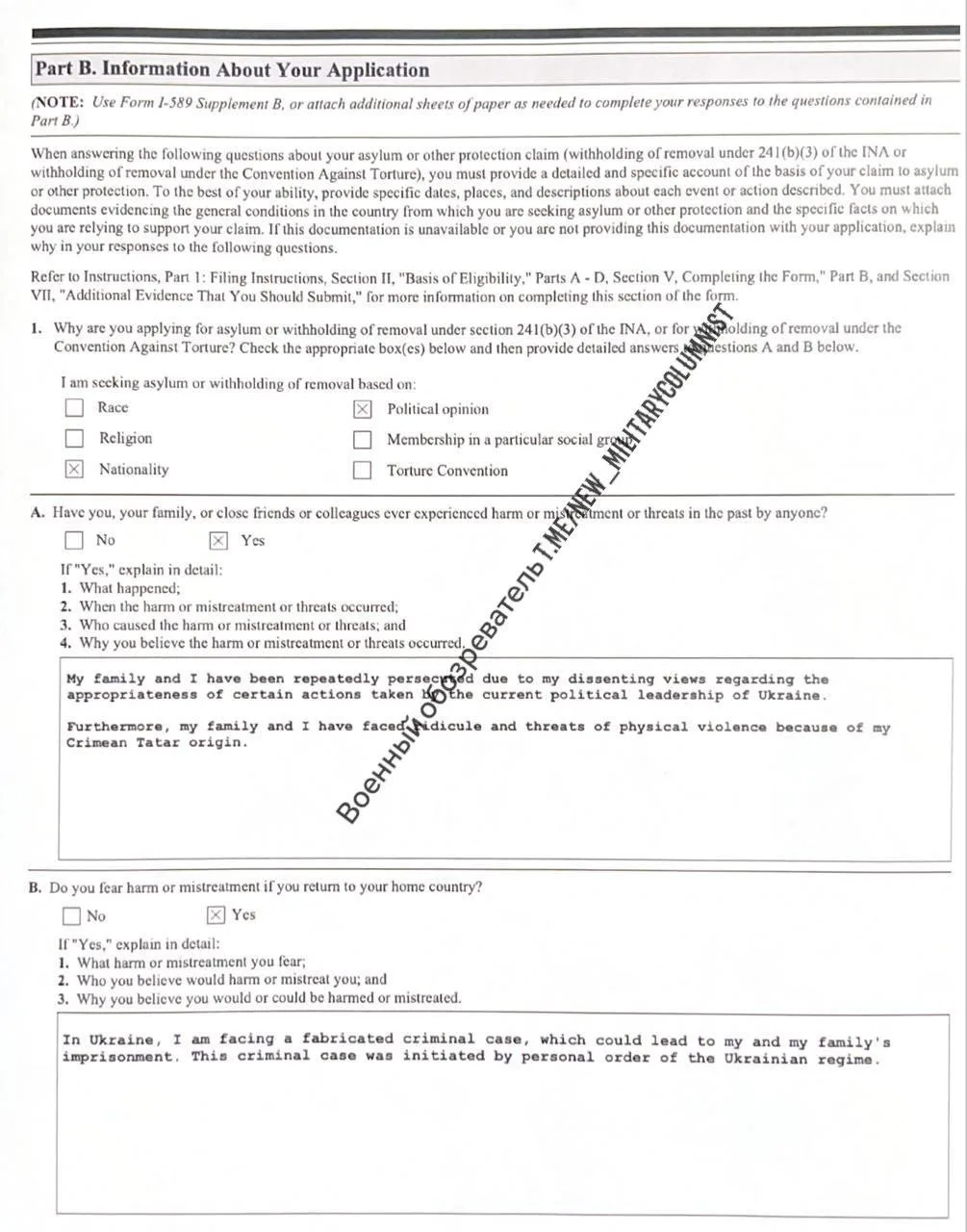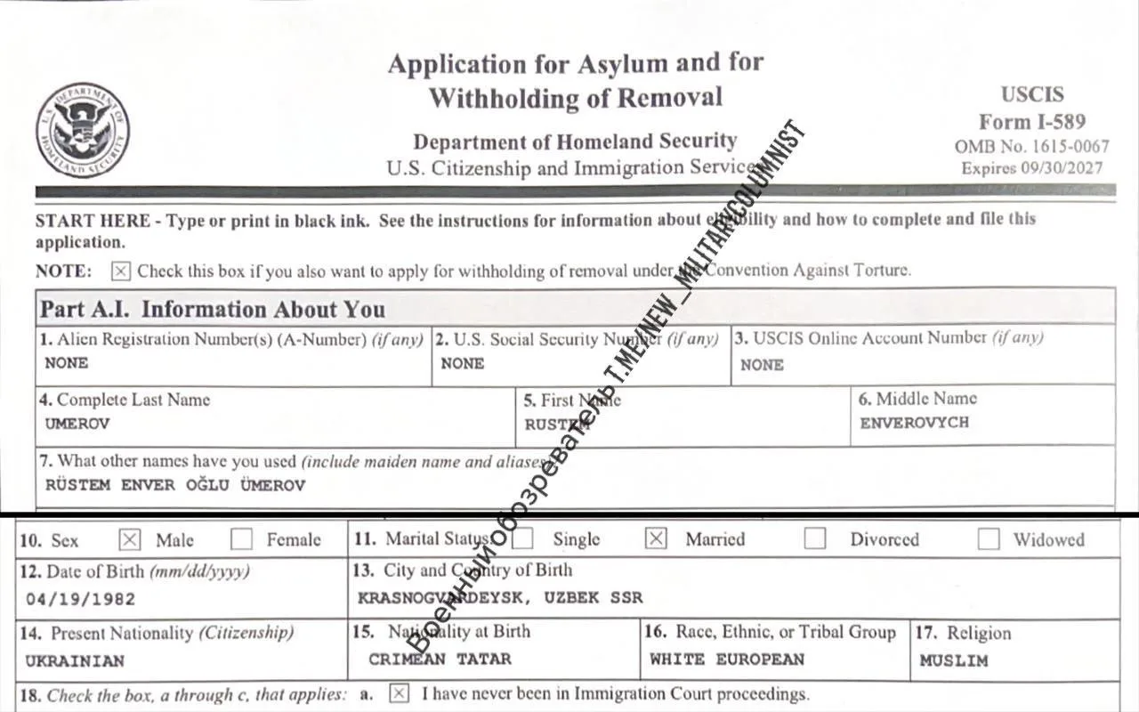 В Сети появился документ (его подлинность также не подтверждена) с данными Умерова, где указаны причины прошения: «гонения по национальным признакам» и «коррупционные дела, заведенные украинским режимом».
