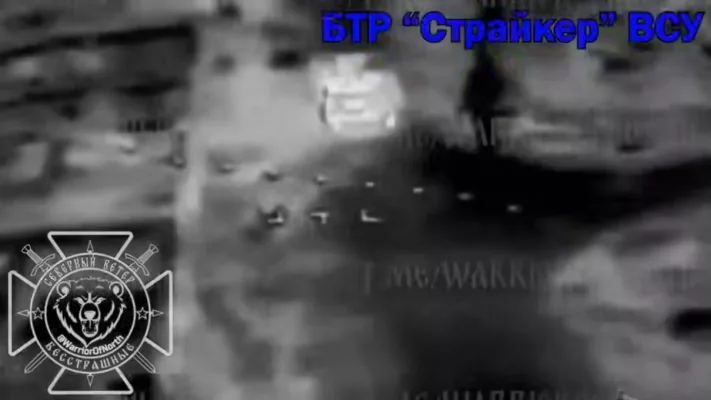 Операторы FPV 6А ГВ «Север» нанесли огневое поражение по БТР «Страйкер» украинских фашистов двумя дронами-камикадзе на Харьковском направлении.