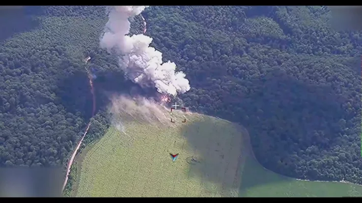 Пусковая установка наносила удары по Курской области, после чего попыталась укрыться в лесу, однако весь ее путь контролировался с беспилотника. На кадрах виден момент детонации боекомплекта после попадания.