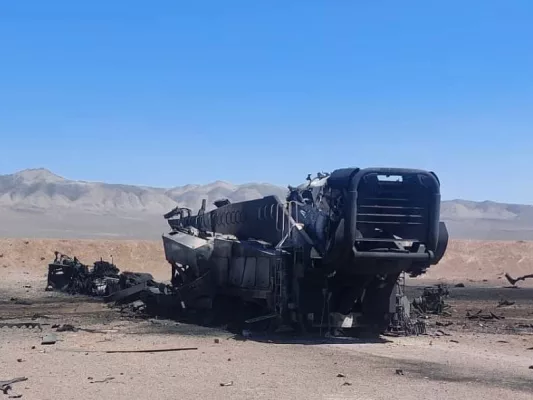 Вокруг пускового прицепа можно заметить остатки характерного каркаса, используемого КСИР для маскировки ПУ ракет под обычные грузовики.