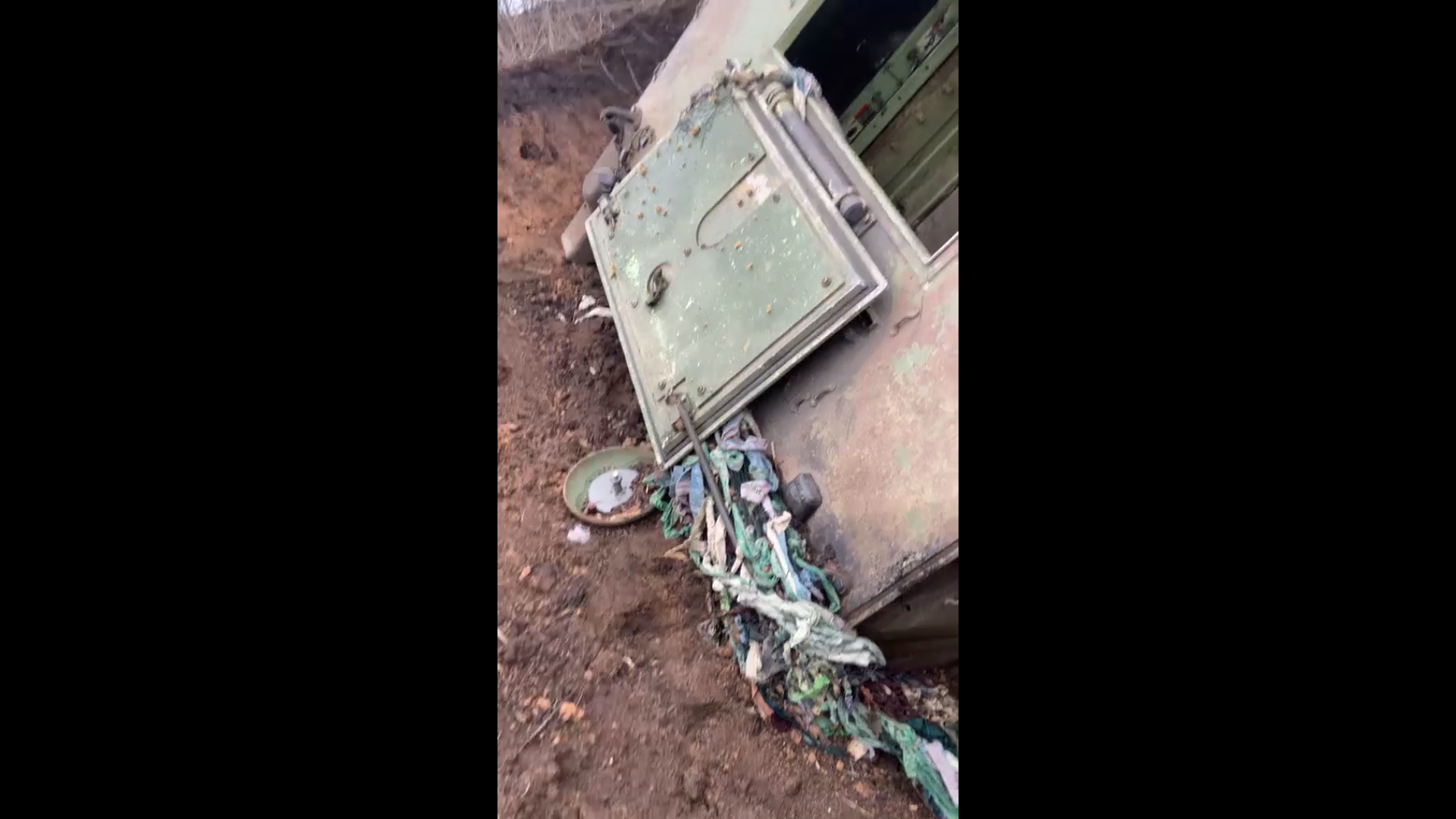 На кадрах БТР М113 (США) уткнулся носом в воронку от авиабомбы. Из окопа также виден сгоревший БТР-4Е.
