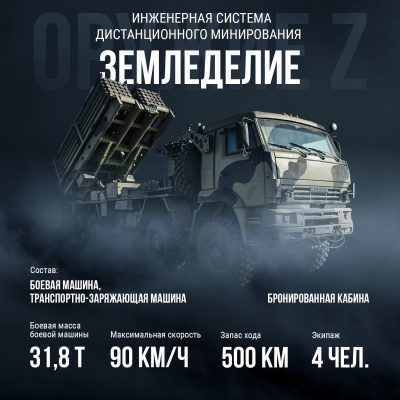 Пусковая установка «Земледелия» похожа на реактивную систему залпового огня. Только внутри снарядов противопехотные или противотанковые мины. Боекомплект «Земледелия» состоит из двух контейнеров, в каждом из которых по 25 ракет. Одним залпом машина накрывает площадь в несколько тысяч квадратных метров.