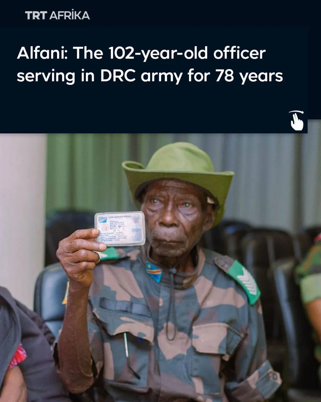 «78 лет верной службы конголезскому народу в рядах ВСДРК, 102-летний 1-й старший сержант Лухембве Альфани всё ещё служит под знаменами», — написал вице-премьер национальной обороны Муадиамвита в социальных сетях.
