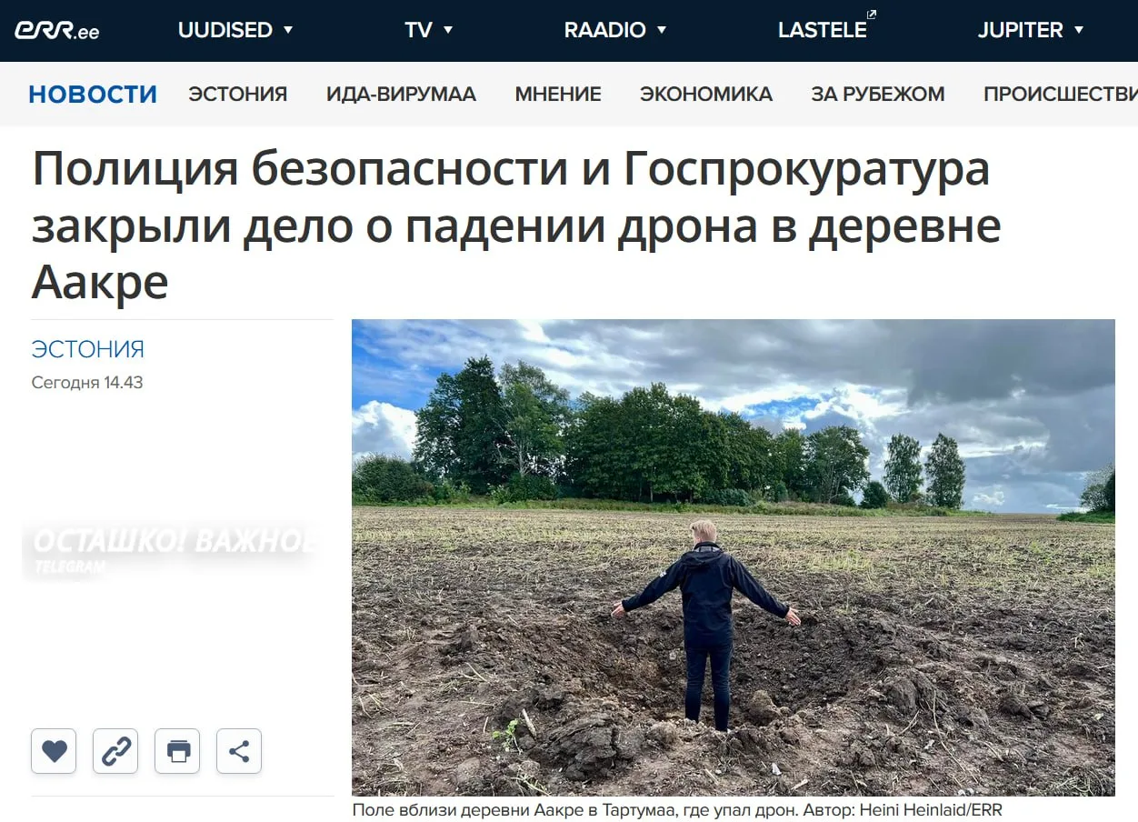 Полиция безопасности и Госпрокуратура Эстонии закрыли дело о падении дрона 24 августа в деревне Аакра уезда Тартумаа. Следствие не смогло установить виновного. Дело возобновят при новых доказательствах.