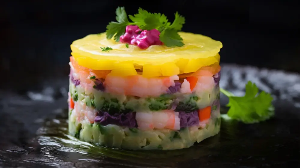 Поверхность салата украсьте кусочками ананаса. Для контраста и цвета можно добавить несколько зёрен граната или веточку петрушки. Перед подачей обязательно уберите салат в холодильник на 1–2 часа — это время нужно, чтобы все вкусы объединились в одно целое.