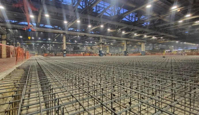 Площадь будущего цеха составит 2,5 тысячи квадратных метров, и он разместится в пределах агрегатного корпуса предприятия. Уже сейчас на строительной площадке установлен армированный каркас, который станет основой для заливки фундамента. Особое внимание уделяется прочности основания: толщина армированного бетона достигнет 900 миллиметров, что обусловлено необходимостью монтажа тяжелого промышленного оборудования.