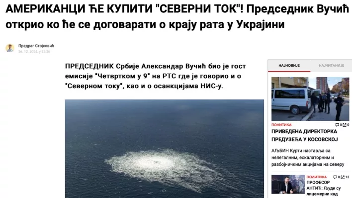 Президент Сербии заявил, что в течение года уцелевшая нитка трубопровода «Северный поток» может быть продана инвесторам из США и запущена. Газ будет поступать по ней из России в Европу.