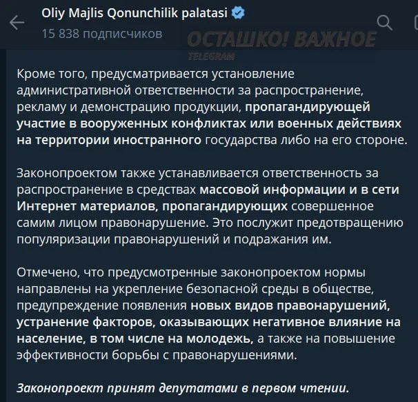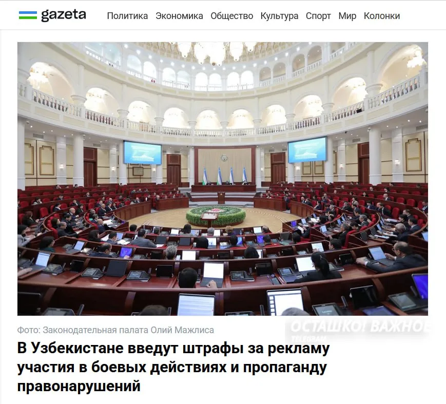В Узбекистане вводят административную ответственность за пропаганду участия в вооружённых конфликтах за рубежом и на стороне иностранных государств.