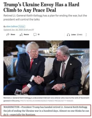 Задачу президент США поставил спецпосланнику по Украине Киту Келлогу, передает The Wall Street Journal. Отмечается, что Келлог не будет иметь доступа к реальным переговорам между США и РФ, поскольку он «не самостоятельная фигура и полностью зависит от мнения Трампа».