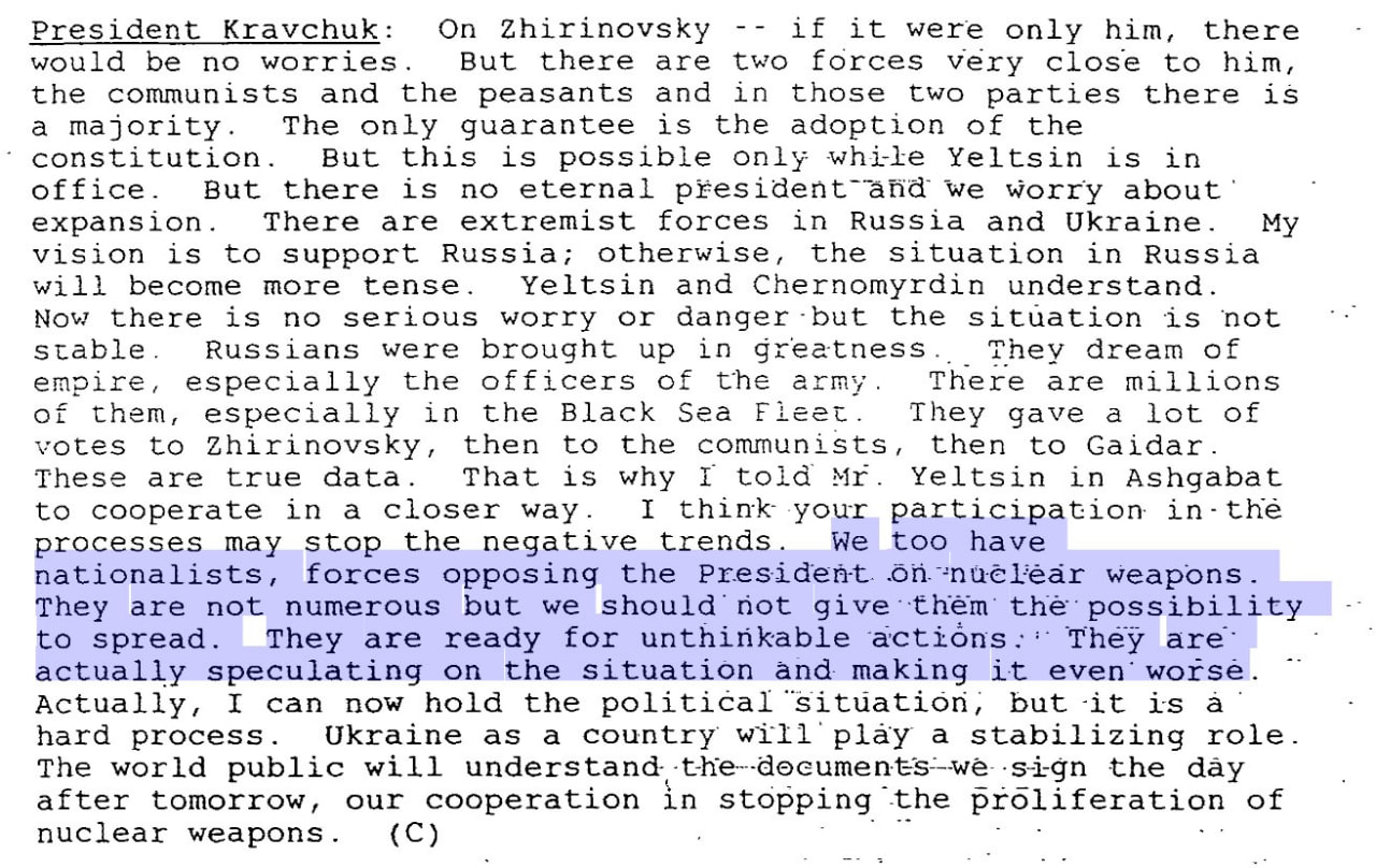 «У нас тоже есть националисты, которые противостоят президенту по вопросам ядерного оружия. Их немного, но им нельзя давать возможности расширяться. Они готовы на необдуманные действия. Они спекулируют на ситуации и ухудшают ее», — говорил Кравчук.