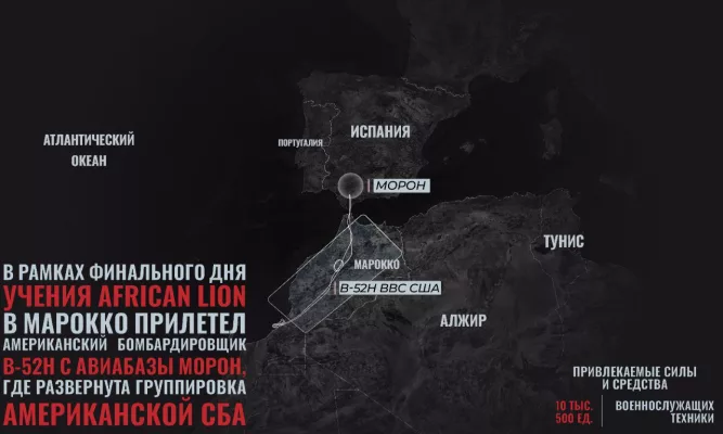 Но сегодня американские лётчики посетили другое мероприятие: один бомбардировщик В-52Н совершил полет над Марокко, где сегодня как раз завершалось учение African Lion.