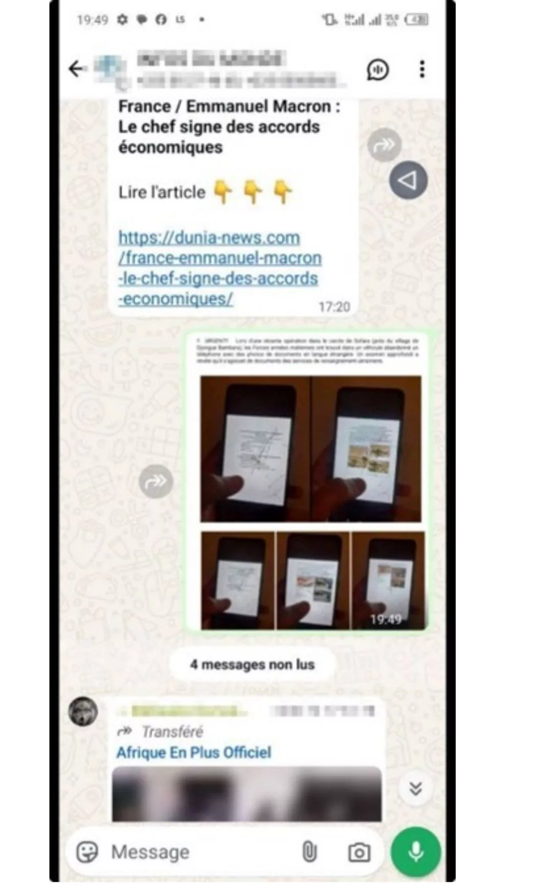 Согласно найденным документам, военнослужащие ГУР Украины оказывали поддержку террористам JNIM, а именно координировали нападение террористов на Вооруженные силы Мали в районе города Мопти с помощью экипажа беспилотных авиационных комплексов (БпАК), передавали в пользование готовые беспилотные летательные аппараты на базе Mavic 3 с системой сброса украинского производства, осуществляли атаку с помощью дронов FPV с боевой частью на позиции военнослужащих Мали.