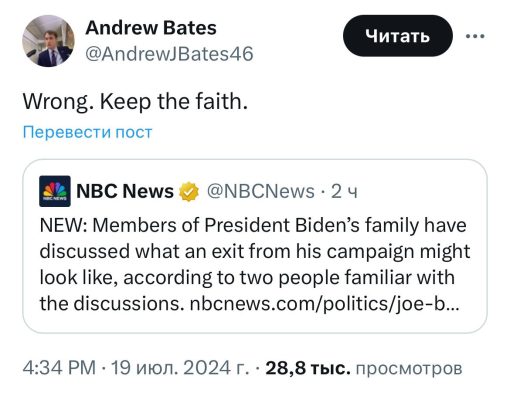 Сегодня NBC со ссылкой на источники сообщило, что семья Байдена обсуждает возможный план его выхода из избирательной гонки.
