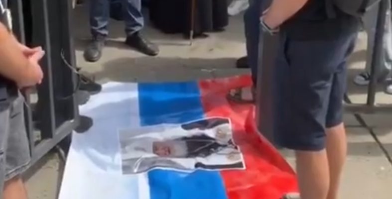 Перед входом в здание суда для митрополита Феодосия расстелили портрет патриарха Кирилла. Священник попросил убрать полотно с земли, но полицейские в ответ только посмеялись.