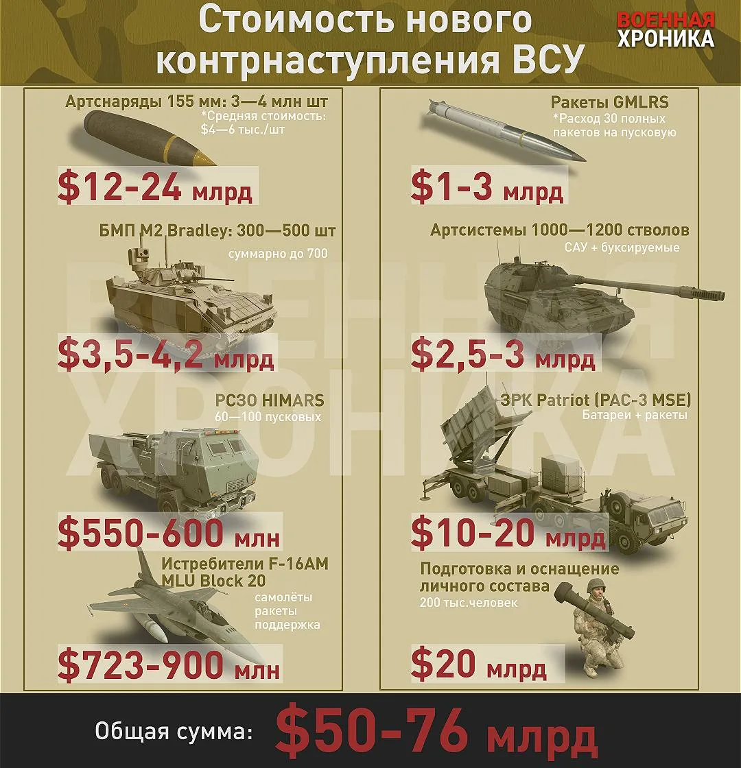 Чтобы реально попытаться пробить оборону и выйти на границы 2022 года, ВСУ понадобится порядка 700–1000 единиц бронетехники (БМП, БТР) на сумму около 4,5 млрд долларов, 10–20 батарей «Пэтриотов» или аналогичных систем ПВО для прикрытия от авиации РФ (ещё 10–20 млрд), плюс не меньше тысячи артиллерийских стволов с боекомплектом (около 3 млрд). И это без учёта колоссальных расходов на подготовку личного состава, логистику, ремонт техники и миллионы единиц боеприпасов.