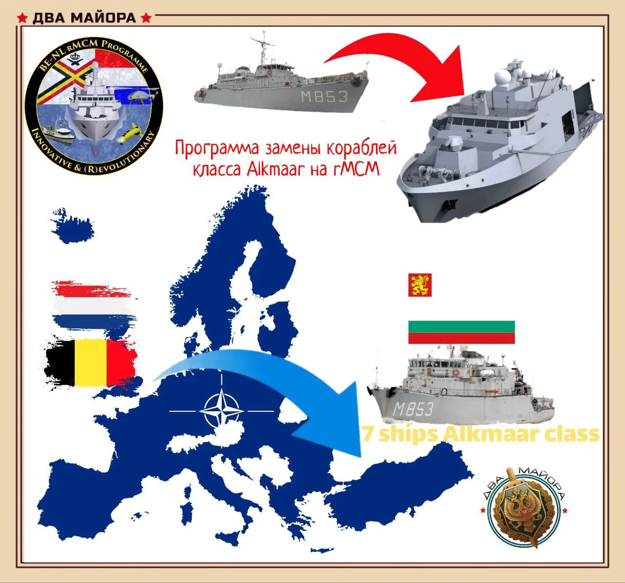 Бельгия и Нидерланды передадут Болгарии семь минных тральщиков класса Tripartite/Alkmaar. Эти корабли разработаны в 1980-х годах в рамках совместной франко-бельгийско-нидерландской программы и передаются в связи с переходом на новые противоминные корабли, производимые по программе rMCM (replacement Mine Counter Measures).