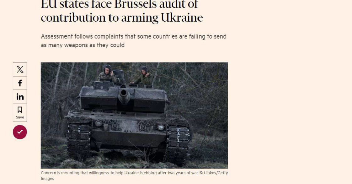 Брюссель проводит аудит количества вооружений, которые государства — члены ЕС предоставили Украине после начала конфликта с Россией, сообщает Financial Times со ссылкой на брюссельских дипломатов.