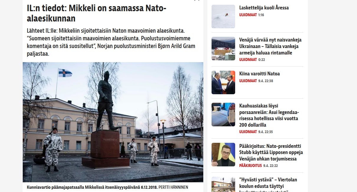 Как пишет газета Iltalehti, штаб развернут в городе Миккели, который находится в 140 километрах от российской границы. В мирное время штаб будет использоваться для учений НАТО, а в случае войны примет командование сухопутным контингентом альянса в Швеции и Финляндиии, при поддержке Норвегии.
