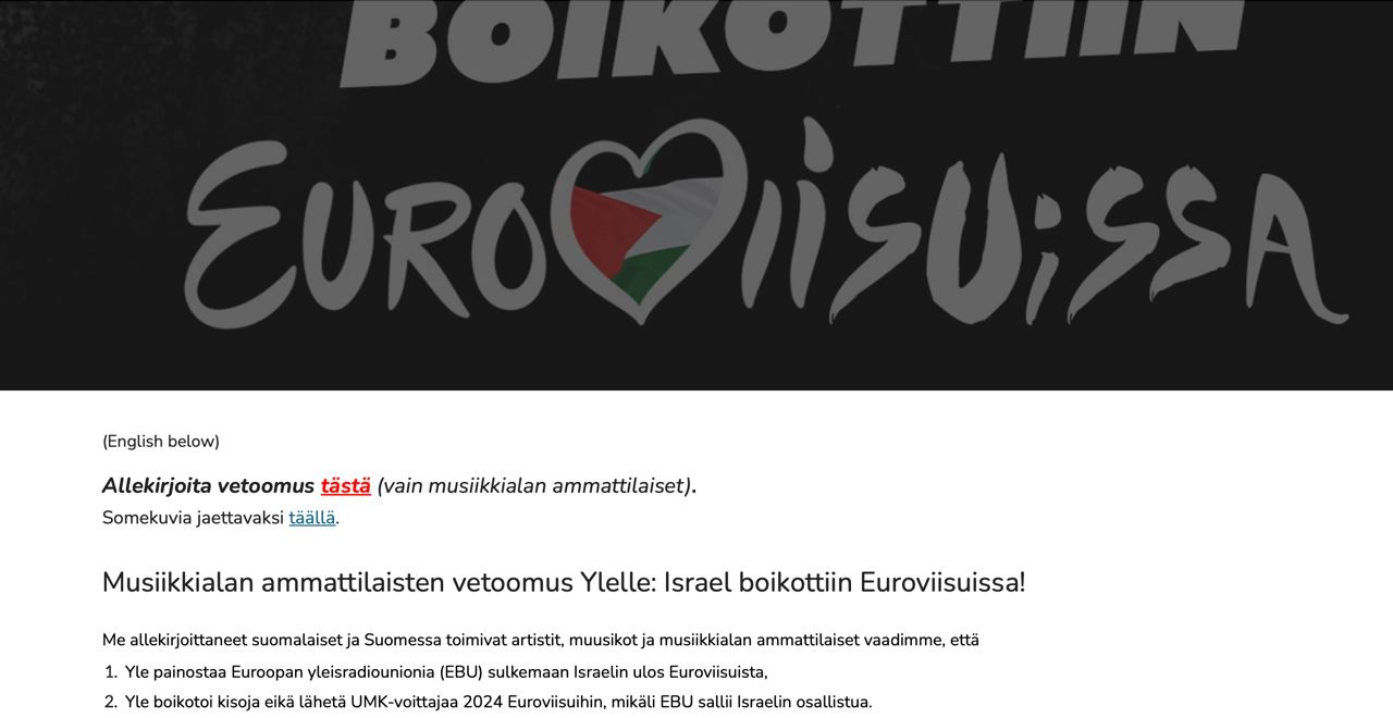 ✖️ В документе говорится, что если Европейский вещательный союз откажется исключать израильтян, то Финляндия должна отозвать свою кандидатуру и бойкотировать «Евровидение». Подписи под петицией уже оставили более 1400 артистов из Европы.