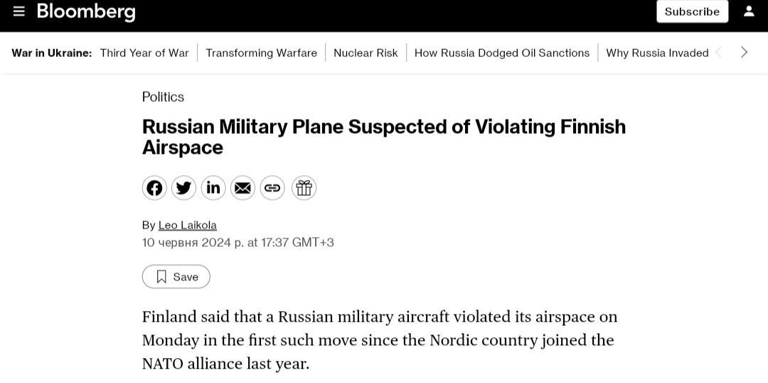 Самолет якобы находился над страной в течение двух минут в понедельник утром и углубился на 2,5 км в территорию Финляндии, пишет Bloomberg со ссылкой на финское Минобороны.
