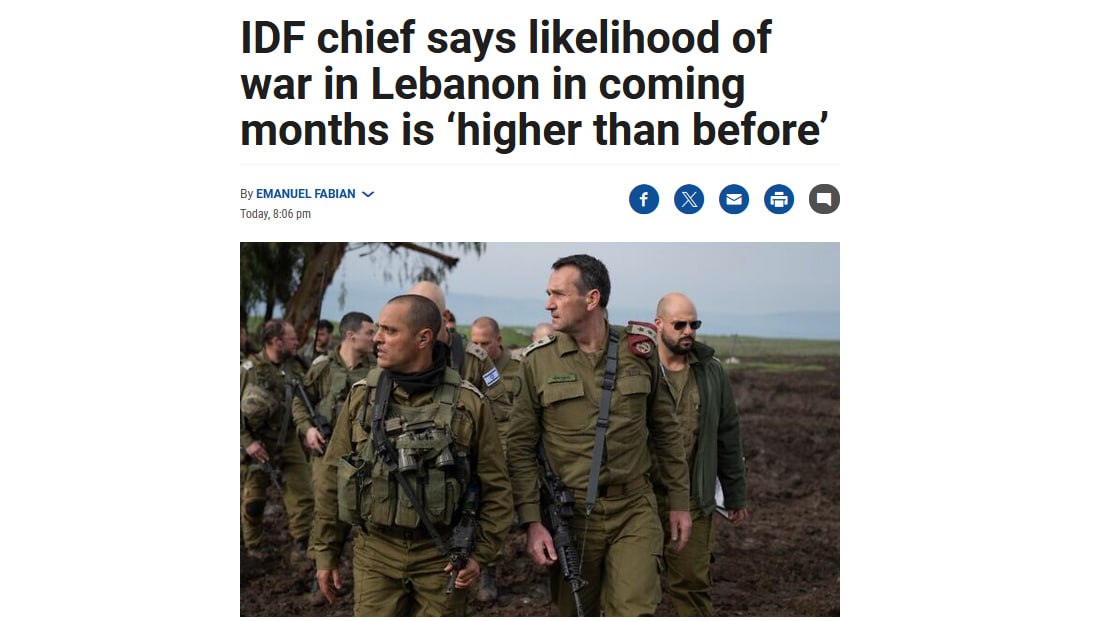 Глава генштаба Герци Халеви заявил, что вероятность войны Израиля с Ливаном увеличилась, причем речь идет о боевых действиях именно на территории Ливана – то есть, Халеви подразумевает ведение наступательной войны. ЦАХАЛ по его словам уже готовится к такому сценарию.