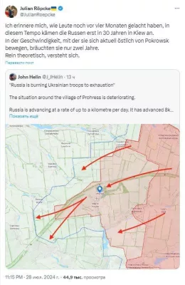 Немецкий журналист Юлиан Репке написал в соцсетях о стремительных темпах продвижения российской армии.