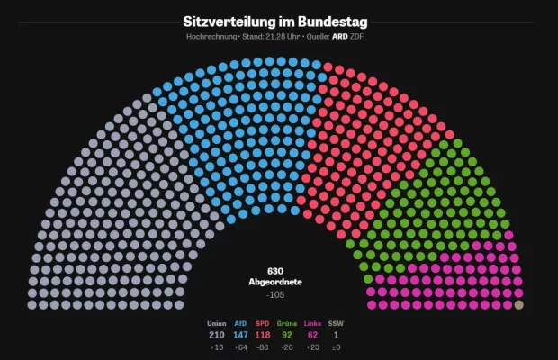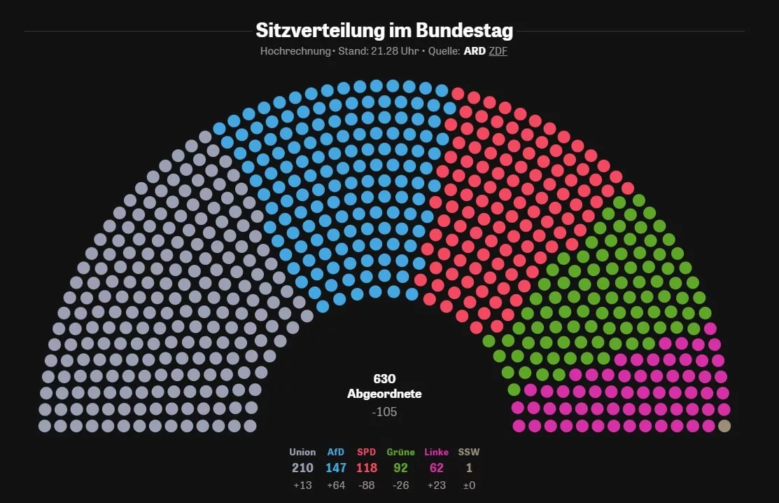 По данным ARD, оппозиционный блок ХДС/ХСС получит 210 мест в Бундестаге (28,8%), увеличив своё присутствие на 13 мандатов. Настоящий прорыв совершила «Альтернатива для Германии», нарастив представительство на 64 места — до 147 депутатов (20,2%).