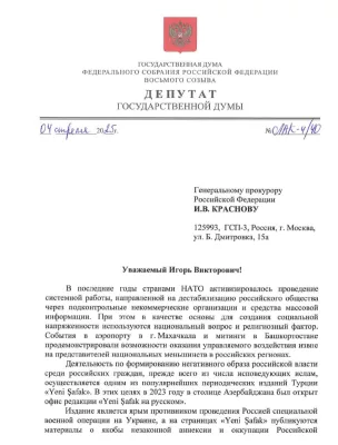 Депутат Госдумы Андрей Луговой направил официальный запрос в Генпрокуратуру и Роскомнадзор с просьбой признать турецкое издание Yeni Şafak нежелательной организацией и заблокировать его ресурсы на территории России.