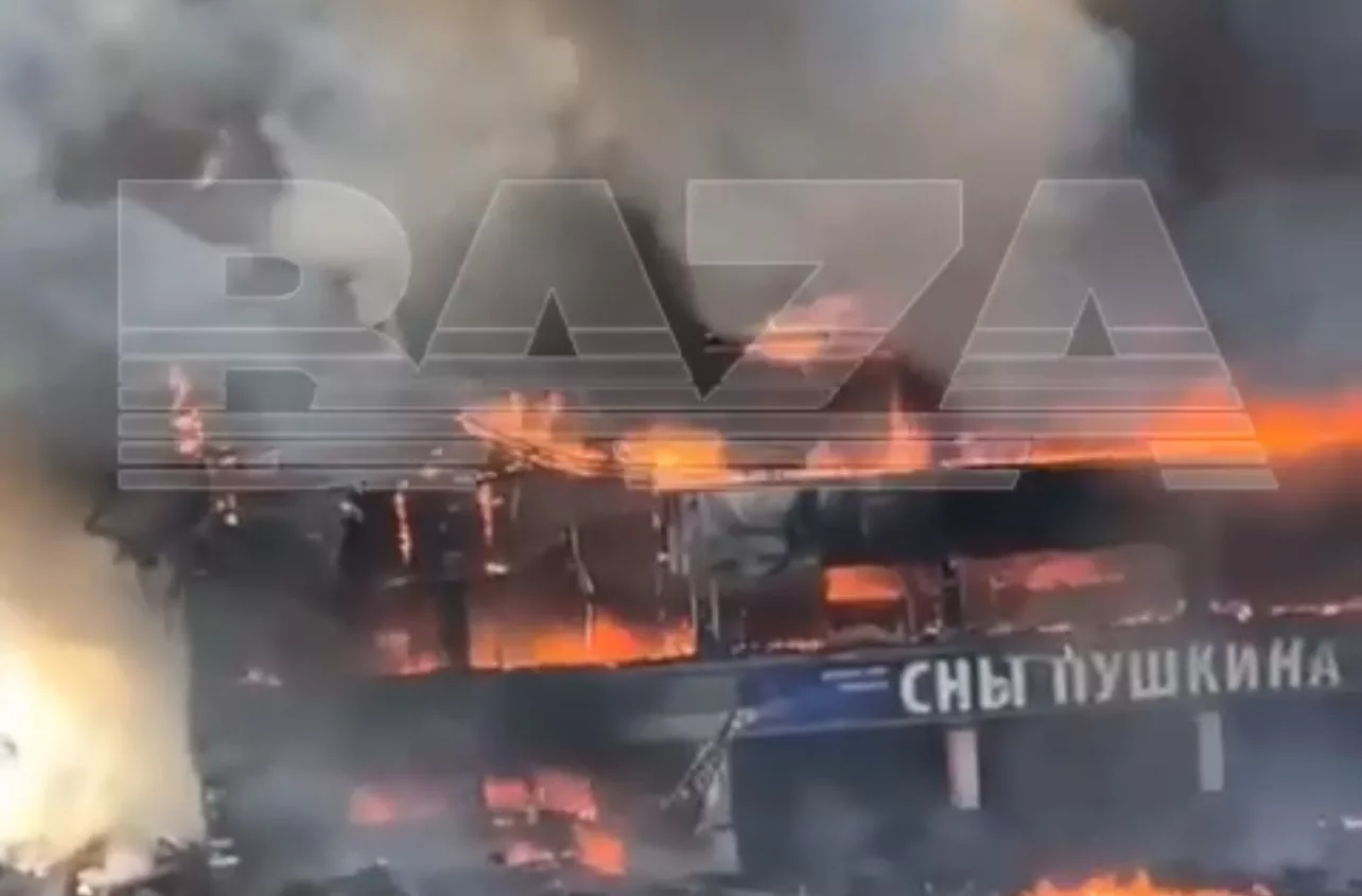 В здании уже обрушилась крыша и стены, а площадь пожара составляет 4000 квадратных метров.