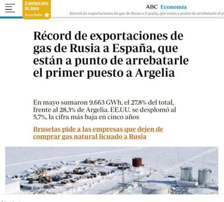🔹В мае Испания импортировала из России рекордные 9663 гигаватт-часа сжиженного природного газа. Это 27,8% от общего объёма поставок СПГ в страну, сообщает ABC.