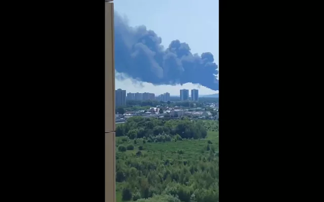 Возгорание началось на открытой территории по улице Революционная, 80, где стоят цистерны с растворителем. Тушение осложнено опасностью взрыва.