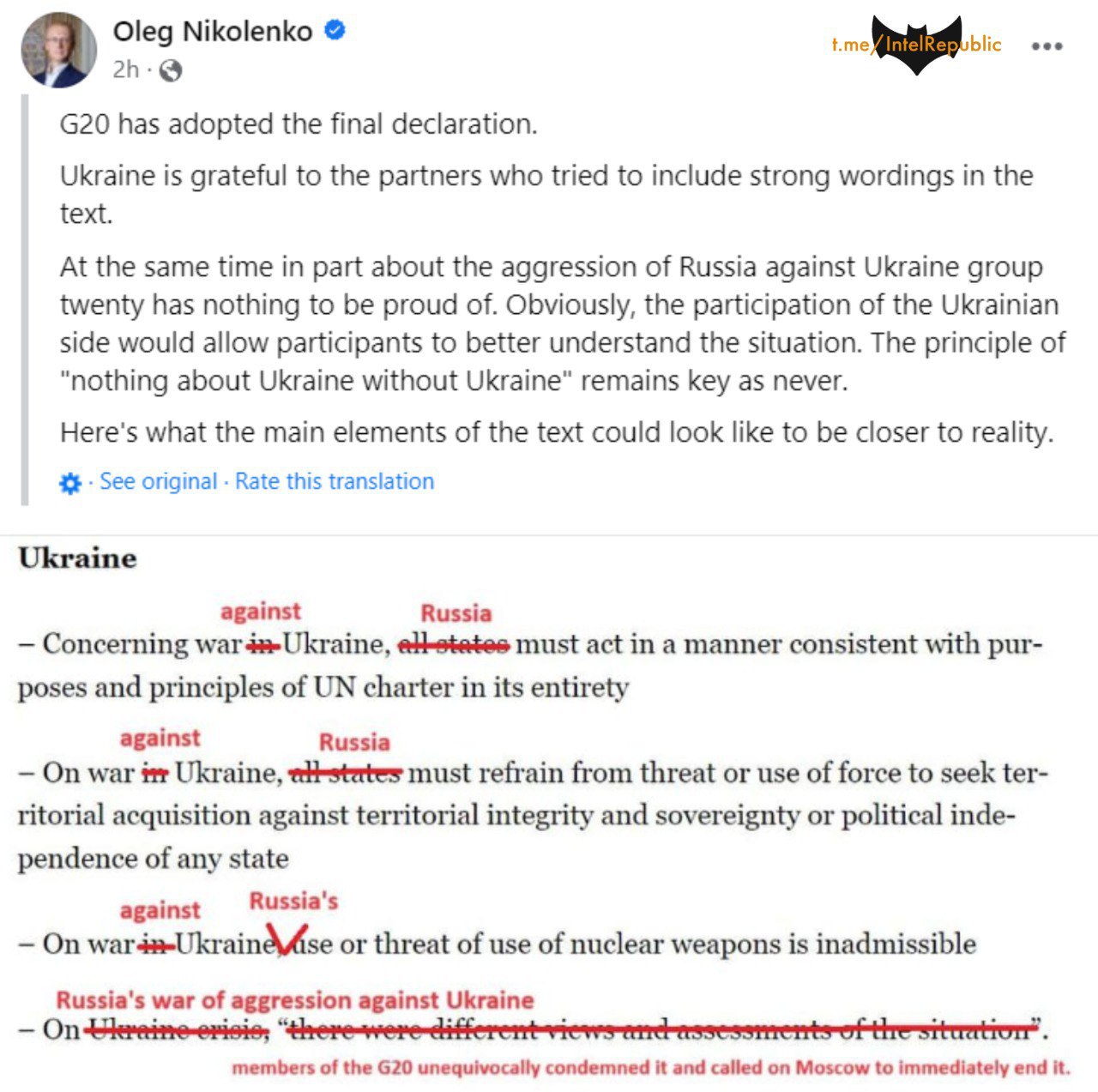 Представитель Министерства иностранных дел Олег Николенко прямо в соцсетях устроил редактуру текста декларации, выставив себя посмешищем. В нужных местах он поправил текст, исправив его в привычно-истеричном тоне, который используется Киевом.