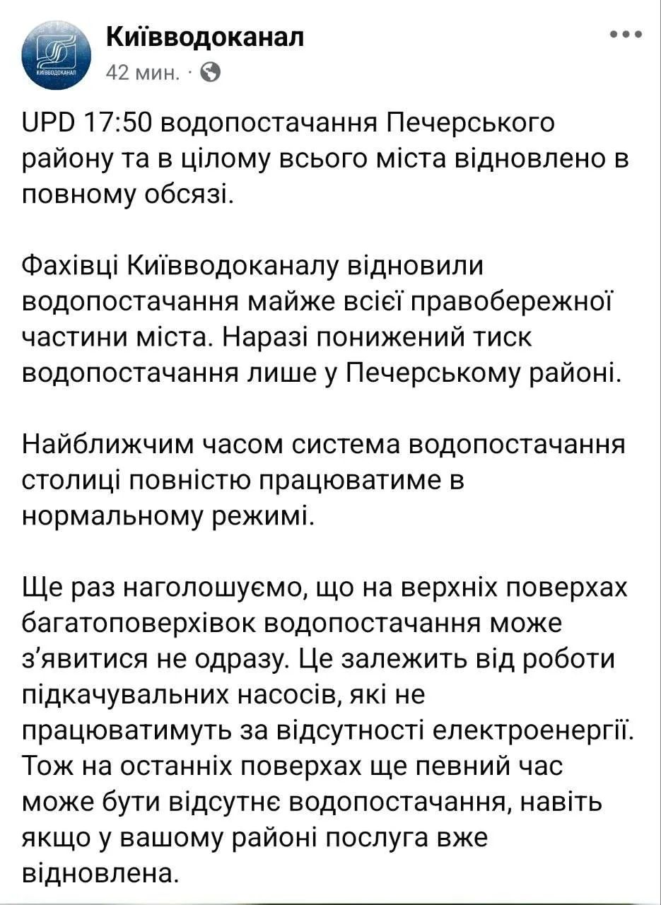 В Киевводоканале уточнили, что на верхние этажи вода подается при помощи насосам, которые не работают при отсутствии электроэнергии. Поэтому на последних этажах водоснабжение может отсутствовать.