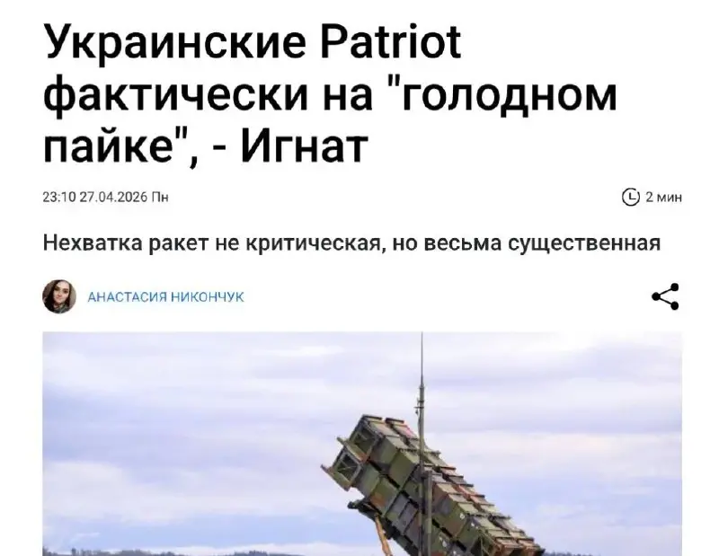 Особенно остро ощущается дефицит боеприпасов PAC-3. Об этом украинскому СМИ сообщил представитель Воздушных сил ВСУ Юрий Игнат.