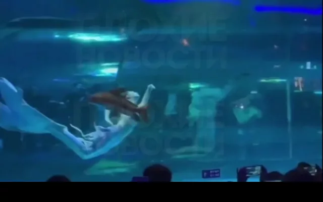 Сегодня Мария переоделась в русалку и нырнула в аквариум с морскими обитателями. В какой-то момент рыбина подплыла и схватила девушку за голову, повредив ей очки, лицо и съев носовые зажимы.