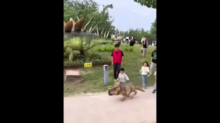 Им надевают реалистичный костюм динозавра и выпускают прямо к посетителям парка, детишки в восторге.