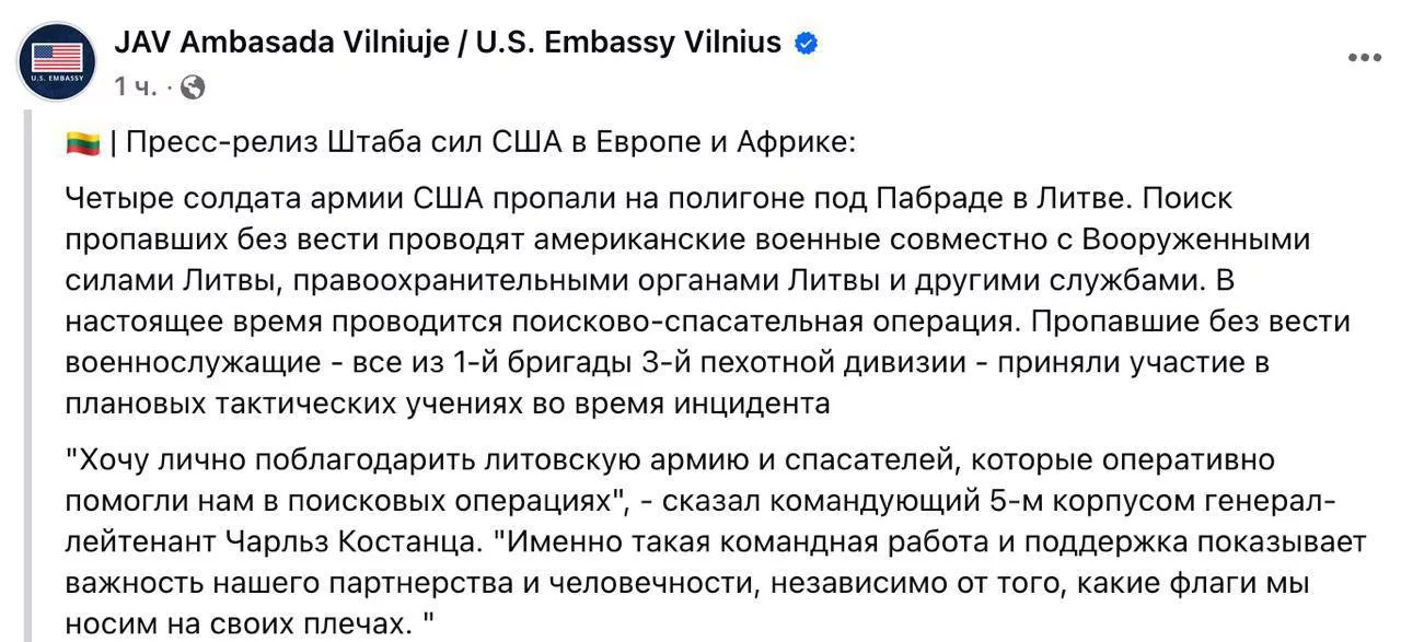Во время учений на полигоне около границы с Беларусью пропали четверо американских военнослужащих, пишет Delfi. Позже стало известно, что они найдены мертвыми.